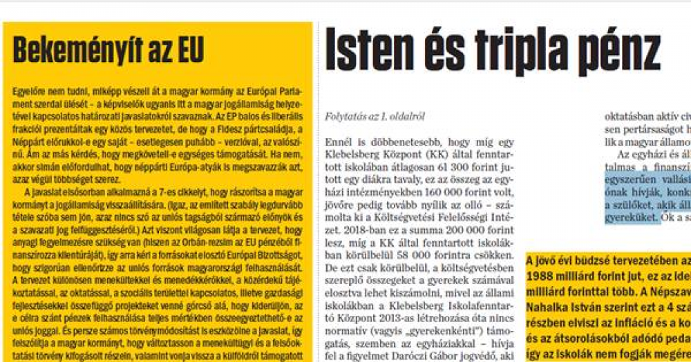 Egyre nagyobb anyagi előnyöket biztosít az egyházi fenntartású iskoláknak a kormány az állami iskolákhoz képest – ez derül ki a 2018-as költségvetés tervezetéből. Az egyházi intézményekkel már eddig is jóval bőkezűbben bánt a kabinet, és a pluszpénzen kívül számtalan más kiváltságot is biztosított nekik: saját tanterv alapján működhetnek, szabadabban választhatnak tankönyvet, saját költségvetésből gazdálkodhatnak, illetve a vezetőiknek munkáltatói jogosítványai vannak. Ráadásul nekik nincs körzeti ellátási kötelezettségük, vagyis akár egyetlen gyereket sem kell felvenniük az iskola környékén élők közül, az egész országból válogathatnak.