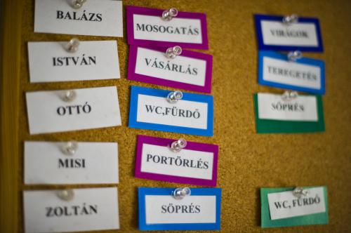 A falon napirend és beosztás függ. Megkérdezem, melyik feladatot szeretik legkevésbé. Egy fiatal férfi, István egyből rávágja, hogy egyiket se szeretik, de azért nevet. A reggeli után gyorsan megcsinálják a házimunkát (vagy százszor nagyobb a rend és a tisztaság, mint nálam), aztán mindenki megy a dolgára. Most éppen nagy az izgalom, hárman is részt vesznek a budapesti képzésen, pénteken van a vizsga, akkor kiderül majd, ki költözhet önálló lakásba.