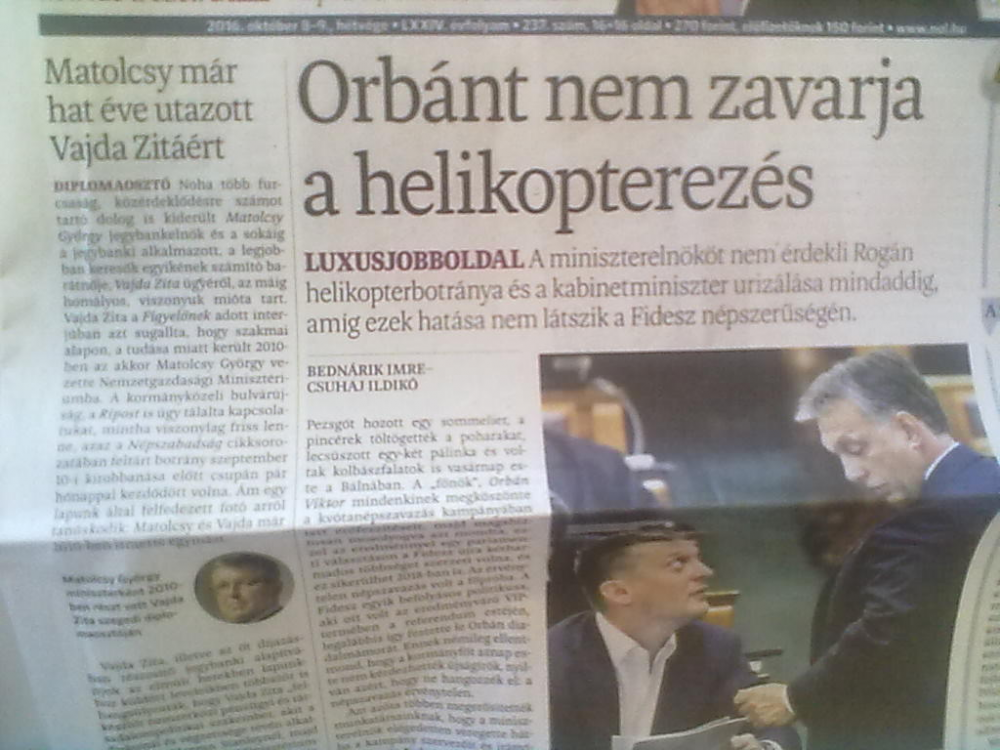 Az újságárusoknál kapható szombati Népszabadság egyébként címlapján folytatja Rogán helikopteres botrányának és Matolcsy és barátnője ügyének feltárását. A Matolcsyról a címlapon kezdődő, és a lap 5. oldalán folytatódó összeállításban a Népszabadság által feltárt lakás-botrány témája is folytatódik.