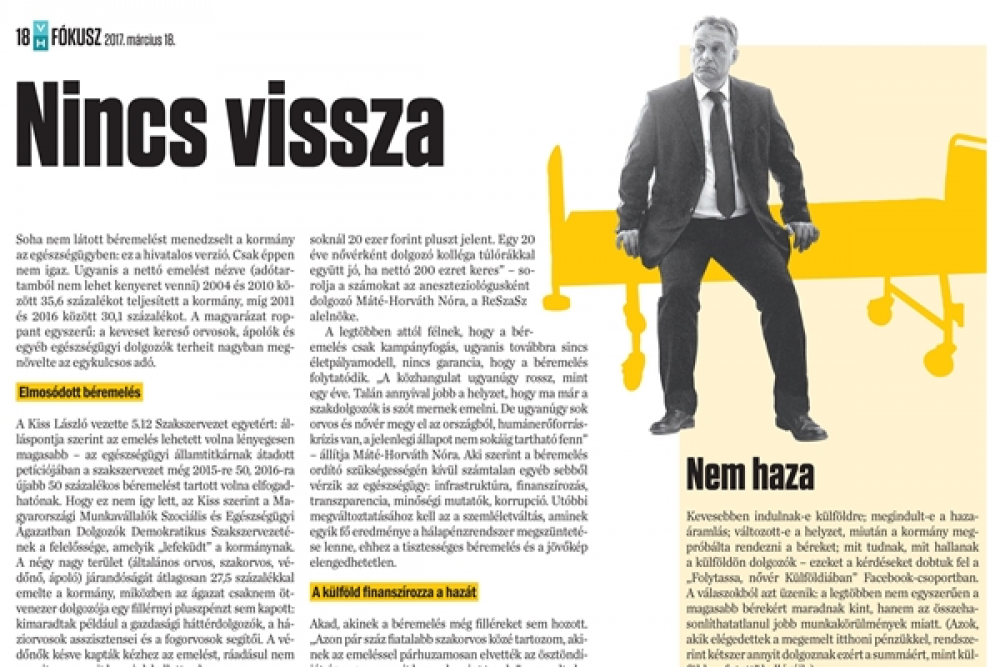 „A béremelés csak tűzoltás volt, persze van pozitív hatása, a filléres gondokat javította, de ettől nem maradnak többen itthon. Ezzel nemhogy a nyugati, de a környező országokkal sem tudjuk felvenni a versenyt. A szakdolgozók átlagosan 26,5 százalékos béremelést kaptak, ez valakinél néhány ezer, másoknál 20 ezer forint pluszt jelent. Egy 20 éve nővérként dolgozó kolléga túlórákkal együtt jó, ha nettó 200 ezret keres” – sorolja a számokat az aneszteziológusként dolgozó Máté-Horváth Nóra, a ReSzaSz alelnöke.