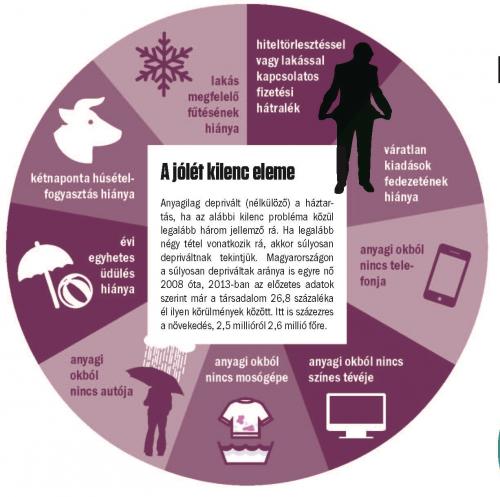 Anyagilag deprivált (nélkülöző) a háztartás, ha az alábbi kilenc probléma közül legalább három jellemző rá. Ha legalább négy tétel vonatkozik rá, akkor súlyosan depriváltnak tekintjük. Magyarországon a súlyosan depriváltak aránya is egyre nő 2008 óta, 2013-ban az előzetes adatok szerint már a társadalom 26,8 százaléka él ilyen körülmények között. Itt is százezres a növekedés, 2,5 millióról 2,6 millió főre.