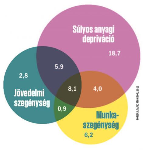 2012-ben a magyar lakosság 17 százaléka volt jövedelemszegény, 19 százaléka munkaszegény, 37 százaléka élt súlyosan deprivált anyagi körülmények között (vagyis nélkülözött). Összességében a magyarok 47 százaléka élt olyan háztartásban, ahol a szegénység és társadalmi kirekesztettség ezen három szempontja közül legalább egyik, 8 százaléka, ahol mindhárom formája jelen volt – derült ki a TÁRKI „Hányan voltak szegények Magyarországon 2012-ben?” című kutatásából. A jövedelemszegénység mértékének meghatározásakor azt vizsgálják, a lakosság mekkora hányada él egy meghatározott jövedelmi szint alatt, vagyis hányan keresnek az átlag magyar jövedelem 60 százalékánál kevesebbet. A munkaszegénység azt mutatja, hogy egy háztartás munkaképes tagjai közül mennyien nem jutnak teljes vagy részmunkaidejű munkához. A súlyos anyagi depriváció azokat a háztartásokat jellemzi, ahol a jólét kilenc eleméből (lásd felsorolásunkat) legalább négy hiányzik.