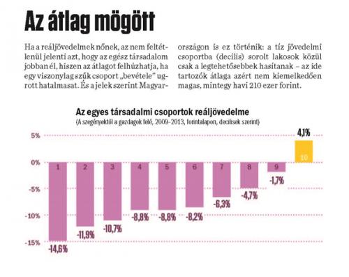 Ha a reáljövedelmek nőnek, az nem feltétlenül jelenti azt, hogy az egész társadalom jobban él, hiszen az átlagot felhúzhatja, ha egy viszonylag szűk csoport „bevétele” ugrott hatalmasat. És a jelek szerint Magyarországon is ez történik: a tíz jövedelmi csoportba (decilis) sorolt lakosok közül csak a legtehetősebbek hasítanak – az ide tartozók átlaga azért nem kiemelkedően magas, mintegy havi 210 ezer forint.