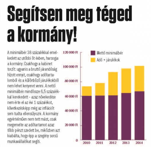 A minimálbér 38 százalékkal emelkedett az utóbbi öt évben, harsogja a kormány. Csakhogy a kabinet torzít: ugyanis a bruttó járandóság hízott ennyit, csakhogy adótartalomból és a különböző járulékokból nem lehet kenyeret venni. A nettó minimálbér mindössze 6,5 százalékkal kerekedett – azaz növekedése nem érte el az évi 1 százalékot, következésképp még az inflációt sem tudta ellensúlyozni. A kormány egyértelműen nem tett mást, csak megemelte az adótartamot azaz több pénzt szedett be, miközben azt kiabálta, hogy épp a szegény sorsú munkavállalókat segíti.