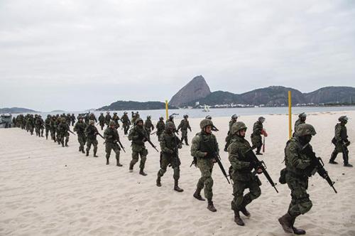 Nem partraszállás. Brazil katonák gyakorlatoznak a strandon, az olimpia megnyitása előtt egy héttel. Háttérben a hírhedt Guanabara-öböl
