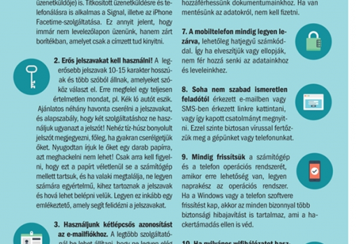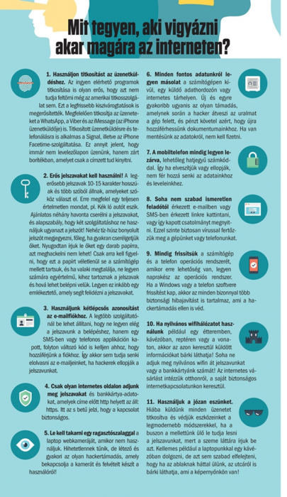 10. Ha nyilvános wifihálózatot használunk például egy étteremben, kávézóban, reptéren vagy a vonaton, akkor az azon keresztül küldött információkat bárki láthatja! Soha ne adjuk meg nyilvános wifin át jelszavunkat vagy a bankkártyánk számát! Az internetes vásárlást intézzük otthonról, a saját biztonságos internetkapcsolatunkon keresztül.