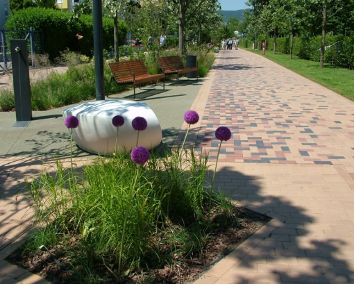 A Dagály sétányon kétoldalt széles klinkertégla-sávok futnak, középen négy méter széles zöldsáv. A csapadékvíz a zöldterületre folyik le, ahonnan a talajba szivároghat. Automata öntözőrendszer védi a zöldfelület életét.