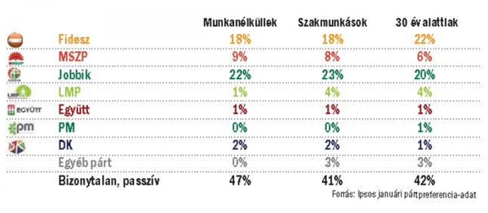 Az, hogy a kormány legfeljebb közmunkát ad (a 25 év alatti fiataloknak is munkanélküli a harmada) nem elégít ki senkit, jegyzi meg Závecz. És mivel más alternatíva nincs (a baloldali térfél egyelőre hiteltelen), az emberek vagy kiszállnak a politikából, vagy marad a Jobbik, amelyik lózungokra és bűnbakkeresésre épít.