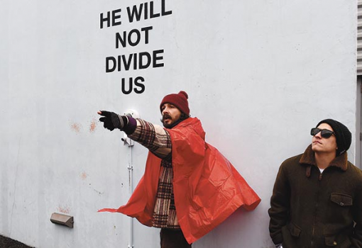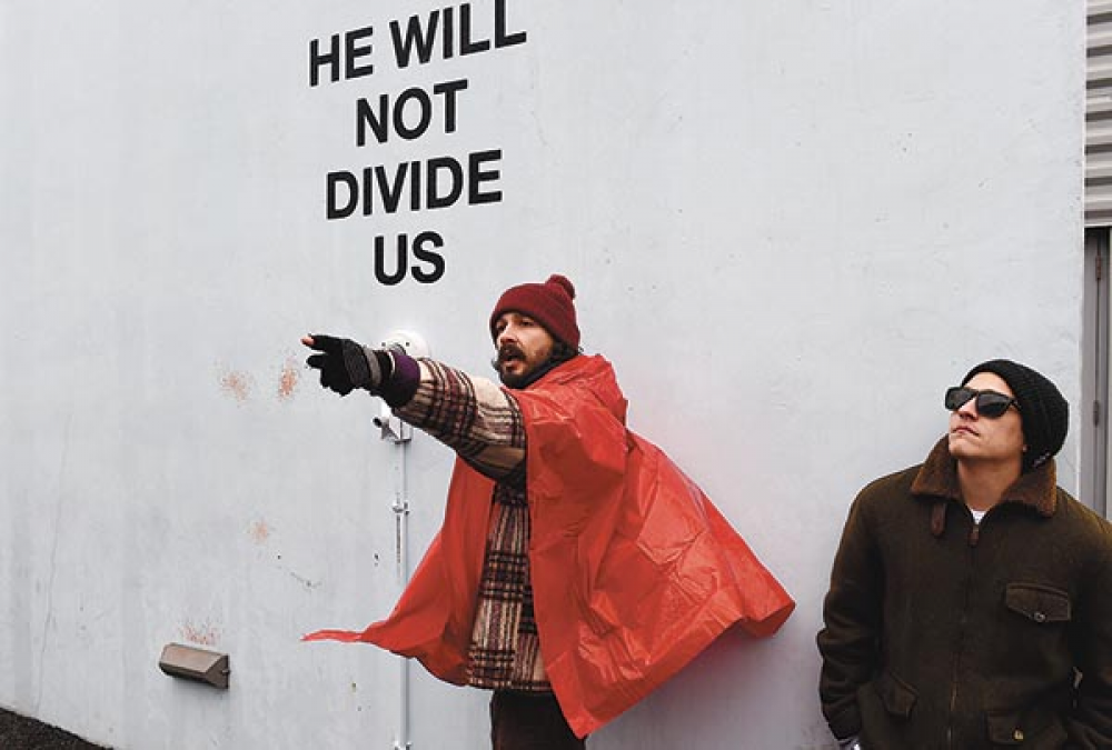 A színész installációt készített a Queens-i Mozgóképmúzeum külső falára: kamerát szerelt fel, ami előtt folyamatosan cserélődnek az emberek, akik azt skandálják: „Nem fog minket megosztani!” Mindezt élőben közvetítik a neten. Megjelent itt egy Trump-szimpatizáns is, és a kialakult lökdösődés után a Transformers-filmek sztárját vitték el bilincsben a rendőrök.