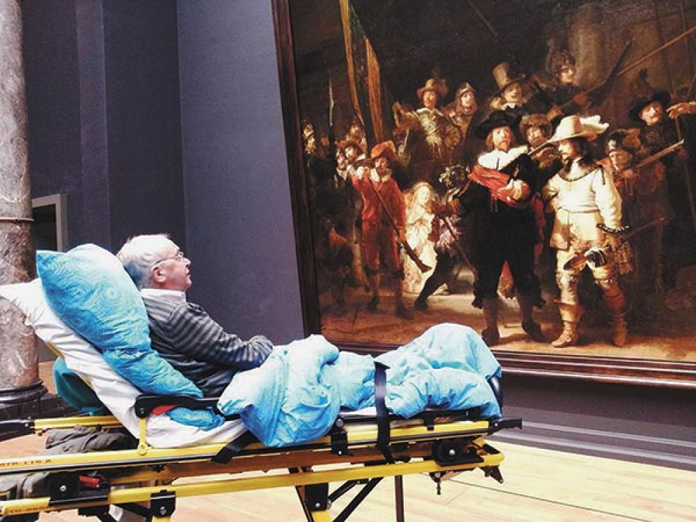Hordágyon, gépekkel együtt tolták őket végig a múzeumon egy holland mentőszolgálat önkéntesei, akik 2007 óta közel hatezer haldokló kívánságait teljesítették már.