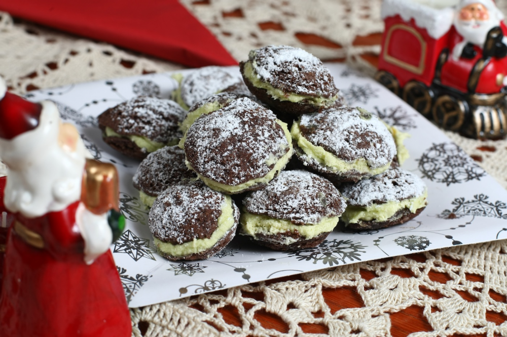 Recept: 14 dkg lisztet, 8 dkg porcukrot, 10 dkg margarint, 8 dkg darált diót és egy evőkanál kakaóport összedolgozzuk, a sütőformákba (diócska híján madelaine forma is megteszi) nyomkodjuk, és megsütjük. A krémhez 2 egész tojást, 4 dkg porcukrot gőz felett vagy a lehető legalacsonyabb hőfokon sűrű krémmé főzzük. Ha kihűlt 10 dkg margarinnal habosra keverjük, mandula aromával (az az igazi, ha zöld) ízesítjük, és összeragasztjuk a diókat. Minél tovább hagyjuk állni, annál finomabb.