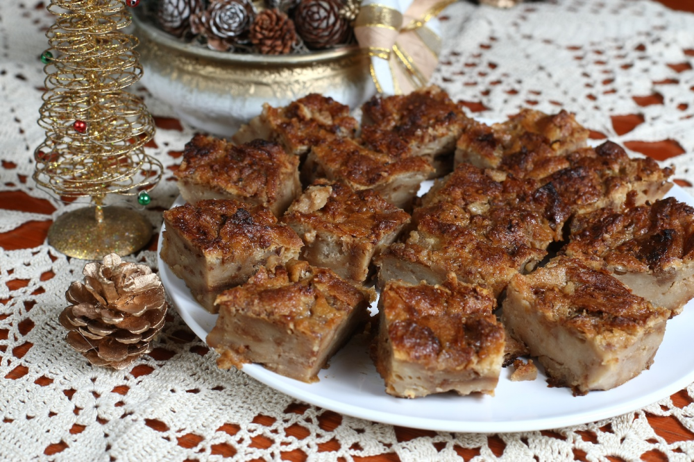 Recept: Egy nagy tepsi karamellás karácsonyi pudinghoz 4-5 szikkadt kifli, croissant, vagy fél kiló kalács kell. A gyerekek nagy élvezettel tépkedik miszlikbe, és szórják a tepsibe, míg én az öntetet készítem. Egy nagyobb lábosban felrakok egy bögre vizet negyed kiló (nád)cukorral karamellizálni. Nigella anyámtól tanultam, hogy a karamellt tilos kavargatni, csak lögybölni-rázogatni szabad, különben kikristályosodik. Ha már majdnem odakap, a békesség kedvéért leveszem a tűzről. Beleöntök 1/2 liter tejet, 2 deci tejszínt, 1 vaníliás cukrot vagy vaníliaaromát, és egy korty alkoholt (pl. amarettót, sherryt) hogy megbolondítsa. Végül 4, lazán felvert tojást adok hozzá, hogy gyönge láng fölött picit besűrítsem. A karamellel bőségesen nyakon öntöm a kifliket, jól megtapicskolom, hogy megszívják magukat. Majd 15-20 percre sütőbe teszem, közepes fokozaton. Nem szabad kiszárítani, a legjobb „szottyosan”, még melegen kanalazva, a dupla ízmámorért vanília fagyival.