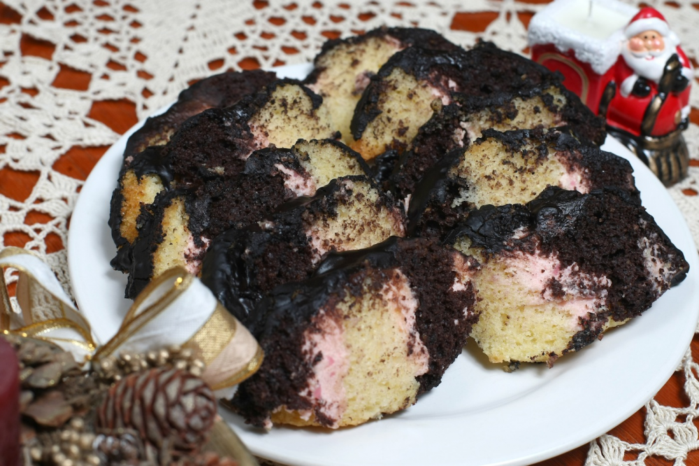 Recept: A piskótához először 1 csomag sütőporral elkeverünk 27 dkg lisztet, 27 dkg cukrot, 4 tojást, ezután belecsorgatunk 1 dl olajat, végül 1 dl meleg vizet. Ha sikerült szépen összedolgozni, kettéosztjuk. Az egyik fele marad világos piskótatészta (ez legyen egy picivel több), a másik feléhez adjunk 2-3 evőkanál jó minőségű kakaóport, és keverjük el. Előkészített (olajjal picit kikenjük és megszórjuk morzsával) őzgerincformába öntjük a tésztákat, és 180 fokra előmelegített sütőben 20-25 perc alatt egyszerre megsütjük őket. Közben elkészítjük a krémet: egy zacskó főzős puncspudingot 2,5 dl tejjel (cukor nélkül) megfőzünk, majd teljesen kihűtjük. Összedolgozunk 20 dkg margarint 20 dkg porcukorral és ha kihűlt a puncsos alap, botmixer segítségével belekeverjük a cukros vajba. Ha a piskóta megsült, az őzgerincforma gerezdjeinek megfelelően felszeleteljük, majd megtöltjük a krémmel a következő sorrendben: barna piskóta, puncskrém, sárga piskóta, puncskrém, barna piskóta – amíg tartanak a hozzávalók a két rúd süteményhez. A végén leöntjük a csokibevonattal, erre mindenkinek saját receptje van, én érzésre melegítem össze a tűz fölött a kakaóport, a cukrot és a vajat. Legalább egy éjszakát hűlnie kell. A süteményt ferdén kell felszeletelni, mert így szépen látszanak majd a különböző színű rétegek.