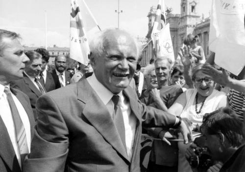 Kép, amely immár örökre belénk ívódott. 1992. október 23-a, ősz hajú ember áll az Országház lépcsősorának tetején. Szótlan és mozdulatlan, szinte vigyázzban áll, leeresztett kezében papír, az elmondani kívánt ünnepi beszéd szövege. Csak a szeme jár, csak a fejét mozdítja, hogy lássa, mi zajlik a téren.
