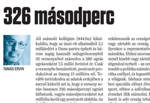 Jól számoló kollégám (444.hu) kikalkulálta, hogy az úszó-vb alkalmából 2,1 milliárdért a Duna-partra épített és három napig használt műugrótoronyból 35 versenyzővel számolva a 280 ugrás ugrásonként 7,5 millió forintot ér. Csak a versenybe beszámított, pontozott produkcióval az összeg 15 millióra nő.