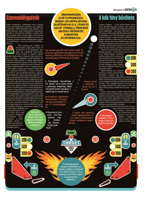 Egyik munkatársunk a flipper erotikus vonatkozásait dolgozta ki, "sötét enyelgésként" mutatva be a 130 gép között cikázó flipperjátékos örömeit és szenvedéseit, másik beszámolónk szerzője a flipper és a horror nem kevésbé sötét árnyalataival incselkedett. Aztán mindketten feljöttek a napfényre.