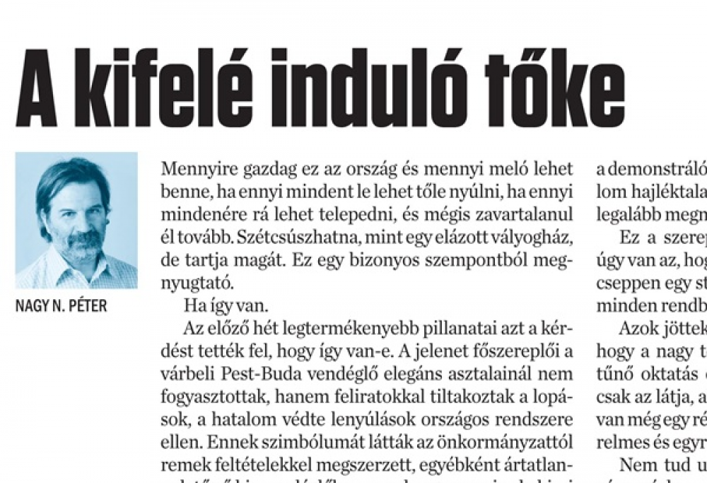 Az előző hét legtermékenyebb pillanatai azt a kérdést tették fel, hogy így van-e. A jelenet főszereplői a várbeli Pest-Buda vendéglő elegáns asztalainál nem fogyasztottak, hanem feliratokkal tiltakoztak a lopások, a hatalom védte lenyúlások országos rendszere ellen. Ennek szimbólumát látták az önkormányzattól remek feltételekkel megszerzett, egyébként ártatlannak tűnő kis vendéglőben, amely egy nem is oly kicsi hálózat része. A hely embere az általa kihívott rendőrökkel akarta elintézetni az elintéznivalókat. Hogy rakják ki ezeket. Egy ideig biztos volt a dolgában és az övéiben, a rendőrökben, ám szembesülnie kellett azzal, amivel oly sokan, amikor az albérlő nem fizet, de ki sem akar menni: a rendőr közölte, hogy a szabályok szerint jegyzői határozat nélkül nem tehet semmit. Kérjenek birtokvédelmet a jegyzőtől. Vasárnap! Másodpercekig álltak egymással szemben szereplőink, és gondolkodtak. Mindkét fél fogta, hogy ez nehéz helyzet, és nemcsak a kamerák miatt, hanem azért is, mert a másiknak is nagyon méltányolható érvei vannak. Ez volt maga a politika! Felmérték, mekkora a mozgásterük, mik a kockázataik. Intelligensek voltak egy reménytelen helyzetben.