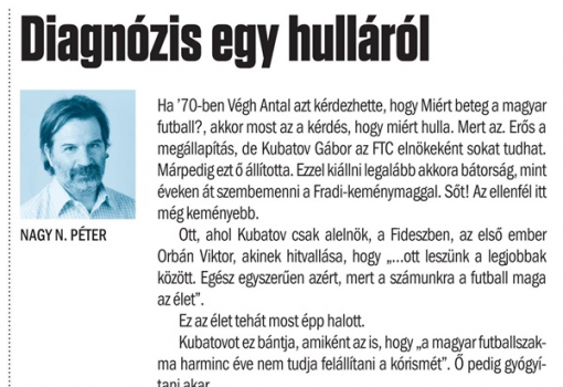 Ha 1970-ben Végh Antal azt kérdezhette, hogy Miért beteg a magyar futball?, akkor most az a kérdés, hogy miért hulla. Mert az. Erős a megállapítás, de Kubatov Gábor az FTC elnökeként sokat tudhat. Márpedig ezt ő állította. Ezzel kiállni legalább akkora bátorság, mint éveken át szembemenni a Fradi-keménymaggal. Sőt! Az ellenfél itt még keményebb.