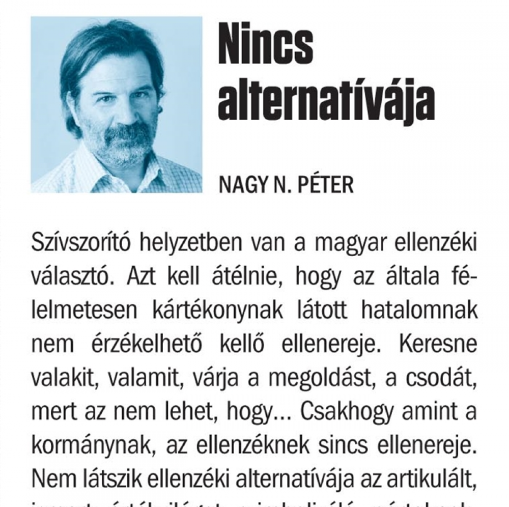 Szívszorító helyzetben van a magyar ellenzéki választó. Azt kell átélnie, hogy az általa félelmetesen kártékonynak látott hatalomnak nem érzékelhető kellő ellenereje. Keresne valakit, valamit, várja a megoldást, a csodát, mert az nem lehet, hogy… Csakhogy amint a kormánynak, az ellenzéknek sincs ellenereje.