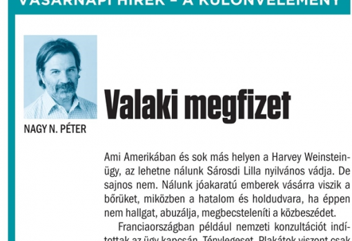 Ami Amerikában és sok más helyen a Harvey Weinstein-ügy, az lehetne nálunk Sárosdi Lilla nyilvános vádja. De sajnos nem. Nálunk jóakaratú emberek vásárra viszik a bőrüket, miközben a hatalom és holdudvara, ha éppen nem hallgat, abuzálja, megbecsteleníti a közbeszédet. Franciaországban például nemzeti konzultációt indítottak az ügy kapcsán. Ténylegeset. Plakátok viszont csak annyiban játszanak szerepet, hogy még a nemzetgyűlésnek otthont adó Bourbon-palota liftjeit is körberagasztotta az igazgatóság a szexuális erőszak büntető törvénykönyvi tényállásával.